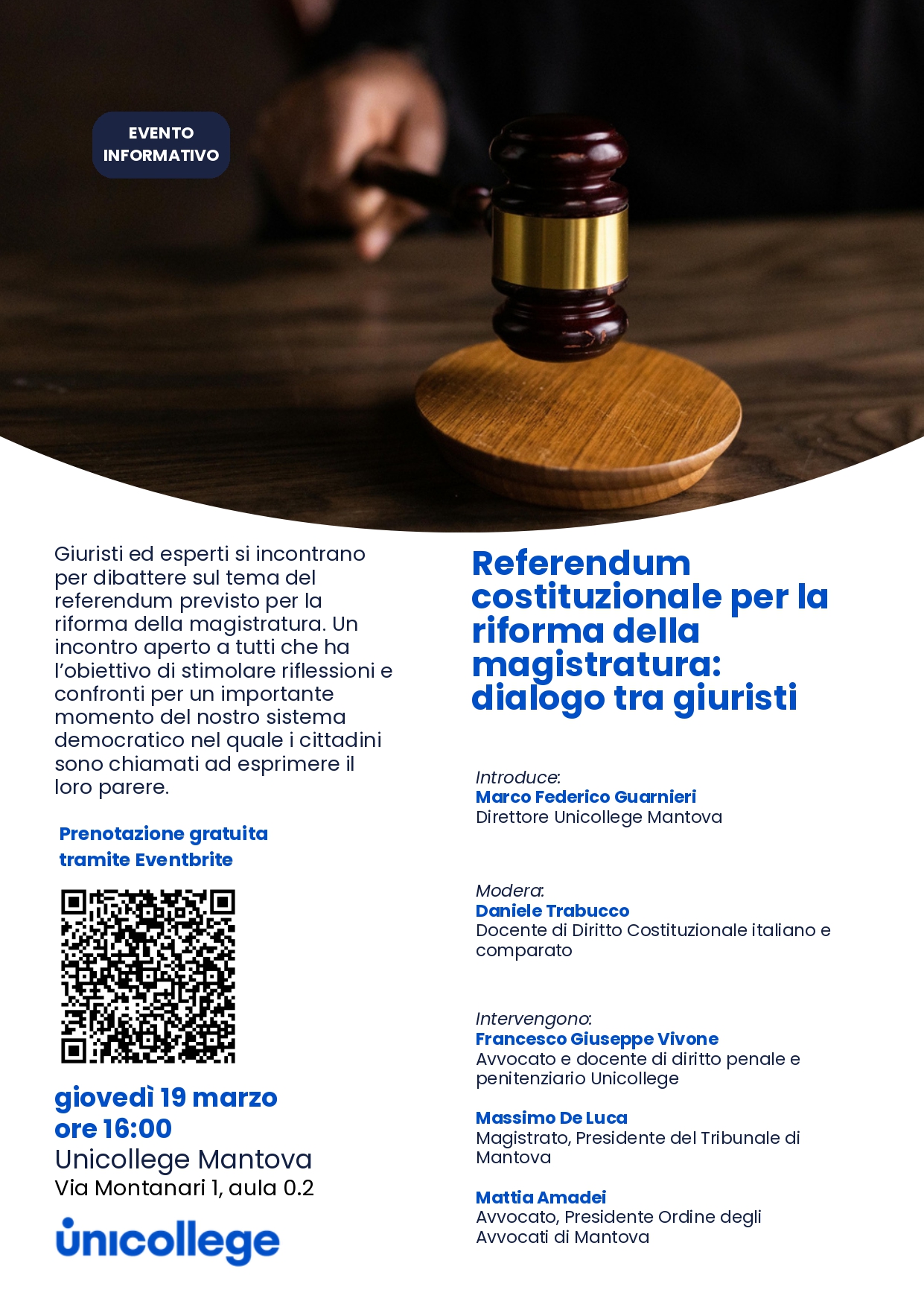 L'evento sarà un'occasione per ascoltare giuristi ed esperti dibattere sul tema del referendum previsto per la riforma della magistratura. L'incontro è aperto a tutti e ha l’obiettivo di stimolare riflessioni e confronti per un importante momento del nostro sistema democratico nel quale i cittadini sono chiamati ad esprimere il loro parere.