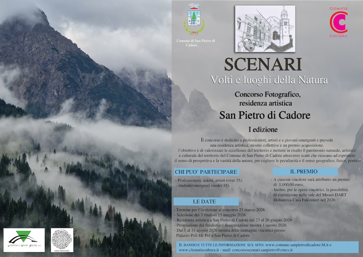 Il Comune di San Pietro di Cadore (BL) in partenariato con l’Associazione Clematis Cultura, con il fine di mettere in risalto le eccellenze legate al patrimonio artistico e culturale, indice il concorso fotografico e residenza artistica "SCENARI: volti e luoghi della Natura", rivolto a fotografi di nazionalità italiana e straniera