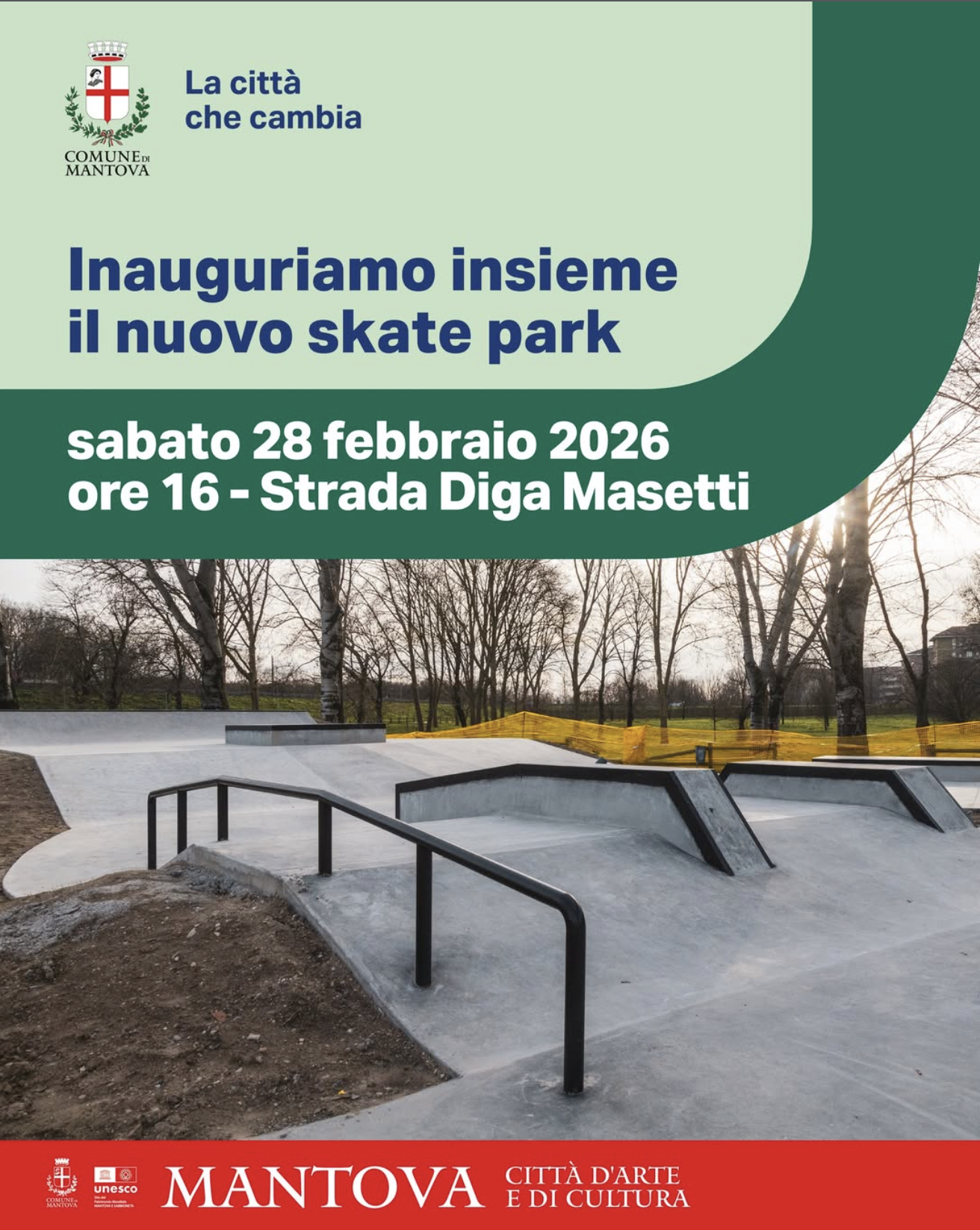 Sabato 28 febbraio alle ore 16.00, sulle sponde del lago in Diga Masetti, verrà inaugurato lo Skate Park di Mantova.