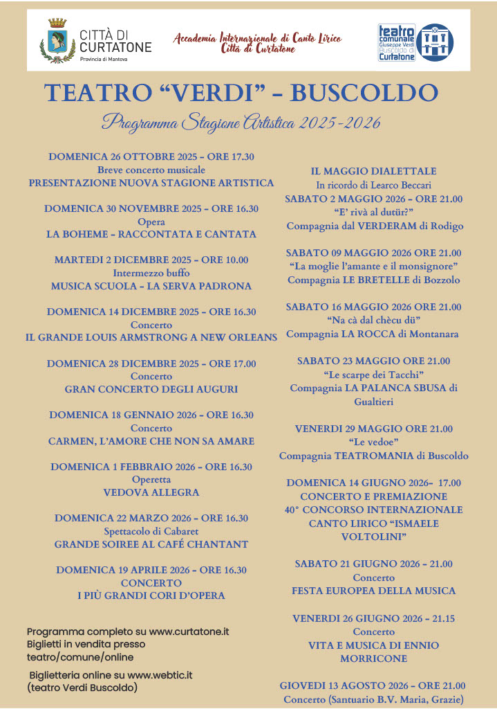 - Stagione artistica presso teatro Verdi di Buscoldo 2025/2026 (vedi programma completo in prima pagina)