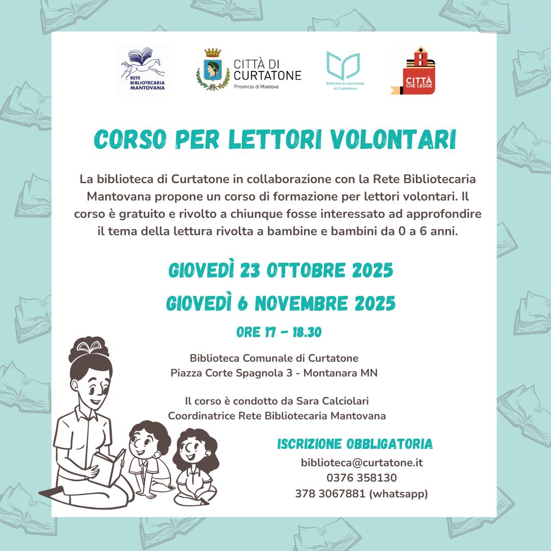 - CORSO PER LETTORI VOLONTARI OTTOBRE 2025 condotto da Sara Calciolari (IN BIBLIOTECA IL 23/10 e 06/11) "ISCRIZIONE OBBLIGATORIA" (Per maggiori info: 0376358130/3783067881 (Whatsapp) oppure via email: biblioteca@curtatone.it)